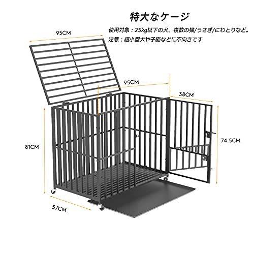 商品情報【快適な大型サイズ】95*57*81cmの特大なペット用ケージで、25kg以下の犬、猫、うさぎ、にわとりに対応します。遊ばせるスペースを確保し、成長途中のワンちゃんを飼育している方や、将来的に数が増える予定なら、便利です 【2つのドア付き】天井部にも正面にも大きなドアが付いているため、シーンに合わせて柔軟な使い方ができます。さらに、ケージ(犬小屋)とサークルを兼用できるので、別途サークルを用意する手間も省けます 【耐久性が高い】頑丈なスチールが採用されていて、角棒の幅が1.5cmでもあり、100kgの重量にも耐えられ、噛み癖がある犬でもボロボロになることがありません。非常に長持ちします 【高品質なキャスター付き】移動に便利なゴム製キャスターが付いているので、部屋の掃除をするときなどに簡単に移動? |