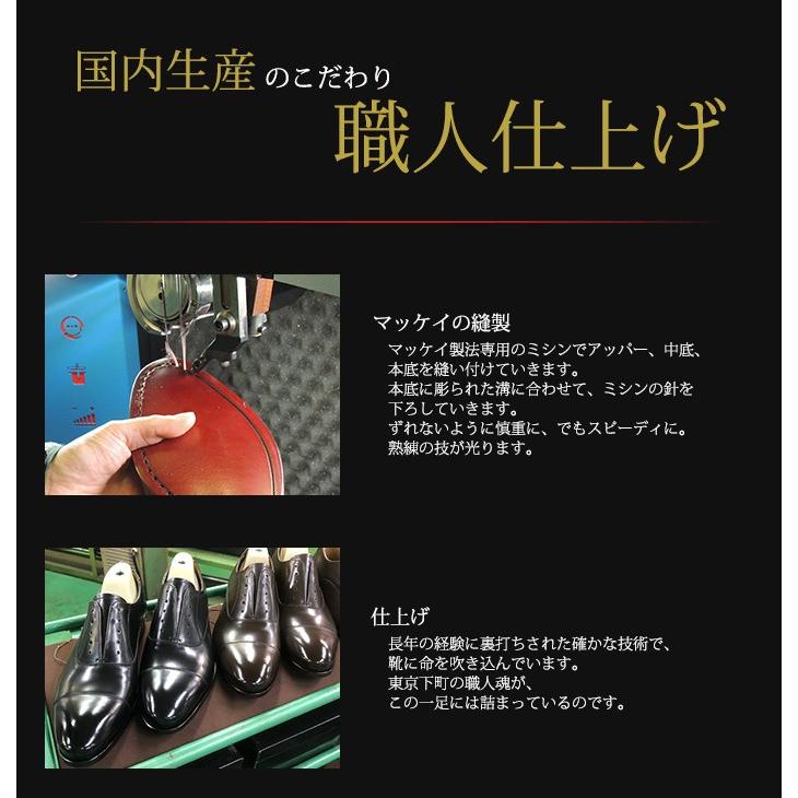 商品情報 使いやすいベーシックな内羽根ストレートチップデザインを、パーツひとつひとつにこだわり、伝統的なマッケイ製法で仕上げた当店オリジナルアイテム 甲材:美しい銀面の上質なキップスキンを贅沢に使用。しなやかで軽量 裏革:つま先からかかとまで、靴の内側はすべて摩擦に強い豚革を使用 中底:日本製の厚みのある牛ヌメ革で、使い込むことによりフィット感が向上 インソール:低反発クッションに厚みのある牛革を合わせたハーフタイプ 本底:牛革製の革底を採用し、革底ならではの高級感を放つ 靴紐:日本製のロウ引き丸紐を採用。細かいパーツにも妥協しない 当店だから出来る、革底タイプの高級革靴でアウトレット並みの価格を実現 高級靴の代名詞ともなる製法のひとつ「マッケイ製法」はシンプルな構造の製法であるためすっきりとスマートなシルエットの靴に仕上がる特徴があり、おしゃれで洗練された印象や足なじみの良さなどからビジネス、フォーマルスタイルからカジュアルスタイルまで、様々な場面、幅広い年代から支持を得ている つり込み、縫製、仕上げ。全てが東京下町 浅草の靴職人の匠の技 |