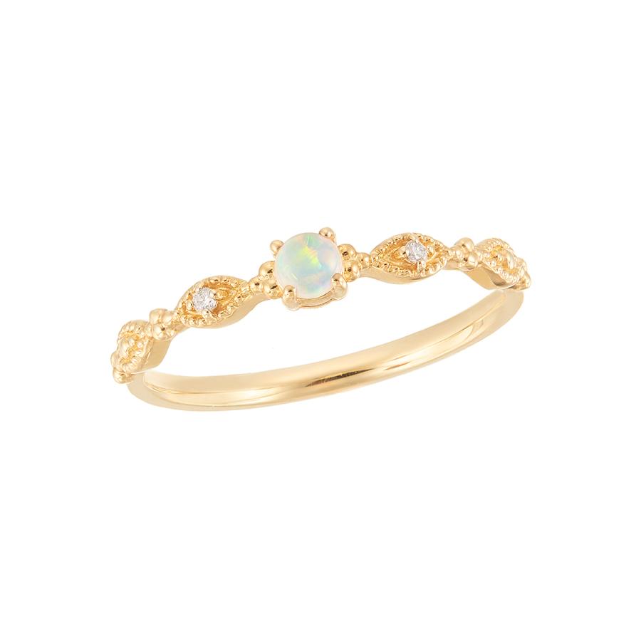 商品情報 オパールのプレイオブカラーの美しさが魅力的。 角度によって様々な色を表すので、思わず目が惹きつけられてしまいます。 アームに繊細に施されたミル打ちが女性らしさをアップ。 可愛らしくも甘すぎないデザインは、長くご使用頂けます。 地金素材:K10YG 使用宝石:オパール・ダイヤモンド 幅:約1.5〜3mm ※こちらのリングは【筆記体】での刻印は出来かねます。予めご了承くださいませ。 |