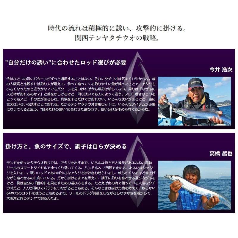 商品情報 積極的に誘い、攻撃的に掛けるための軽さ、細さ、高感度。 最新釣技でテンヤタチウオの頂点を目指す。 かつては捉えきれなかった極小のアタリを明確に感じ取れる、最新の関西テンヤタチウオ事情に特化した専用ロッド、SABER MASTER TENYAが誕生。穂先には感度重視のタフテック、ソフトな曲がりのグラスソリッドのそれぞれにハイパワーX構造を施しブレを抑制。繊細な感度と微妙なモタレさえ感知できる2タイプの穂先性能を与えました。ブランクスにはスパイラルX構造を採用することでネジレを追放。軽さと高い操作性、さらに穂先で得たアタリ感度を減衰させることなくバット部に伝える高感度仕様です。持ち方を選ばず手にフィットするマルチパーミングCI4+シートは、タチウオ専用ロッドにふさわしいメタリック調に仕上げました。シビアな状況下で喰い込ませる釣りから積極的に掛けにいく釣りまで、最新のテンヤタチウオに対応する全5アイテムのラインナップです。 T64ML190 喰い渋りを制する“ フィネススペシャル” タチウオが喰い渋る状況下、アタリの出にくいときに威力を発揮する繊細で曲がる6:4調子。特に電動スロー巻きなどでの喰い込み性能は秀逸。巻上げを |