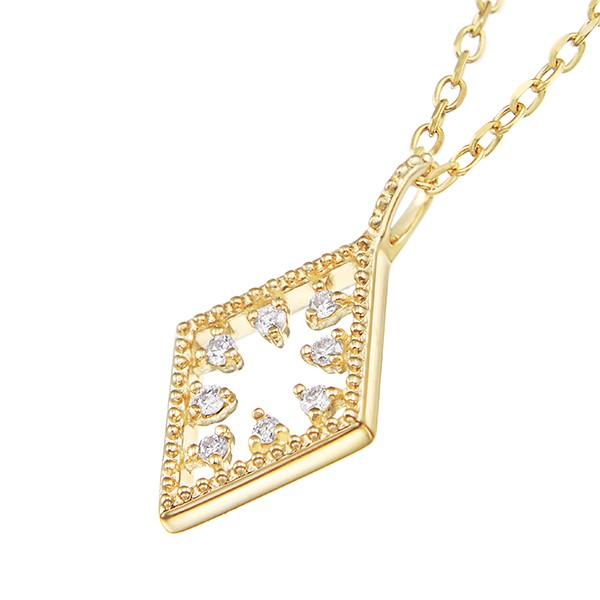 商品情報 ミルグレイン加工がクラシカルなスクウェアモチーフネックレス。 あえて空間を開けて留めたダイヤモンドが、レーシィな印象。 細部にまでこだわってデザインしたネックレスです。 お揃いのピアスもあります。 地金素材:K10YG 使用宝石:ダイヤモンド 長さ:約40cm(アジャスターカン付) トップの大きさ(縦×横):約13.5×7.5mm |